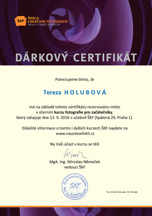 Formou dárkového poukazu je možné věnovat kterýkoliv z nabízených fotografických kurzů ŠKF. Pokud váháte, který kurz by byl pro obdarovaného vhodný, nebo máte k dispozici jen určitou částku, certifikát Vám vystavíme také a jeho textaci příslušně upravíme. Na požádání můžeme do jeho textu doplnit také Vaše osobní věnování.